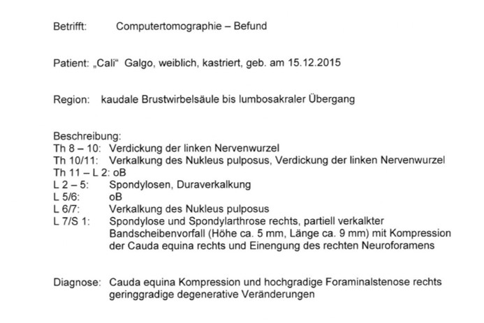Die Spondylose musste unbedingt genauer abgeklärt werden. Fragen wie - kann man operieren, reichen Physiotherapien, wie schaut es mit Freilauf aus, wie sind überhaupt ihre Lebenserwartungen - stellten wir uns. Es wurde klar, ein CT wird benötigt.