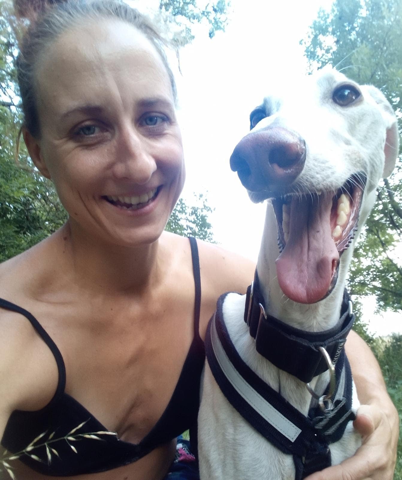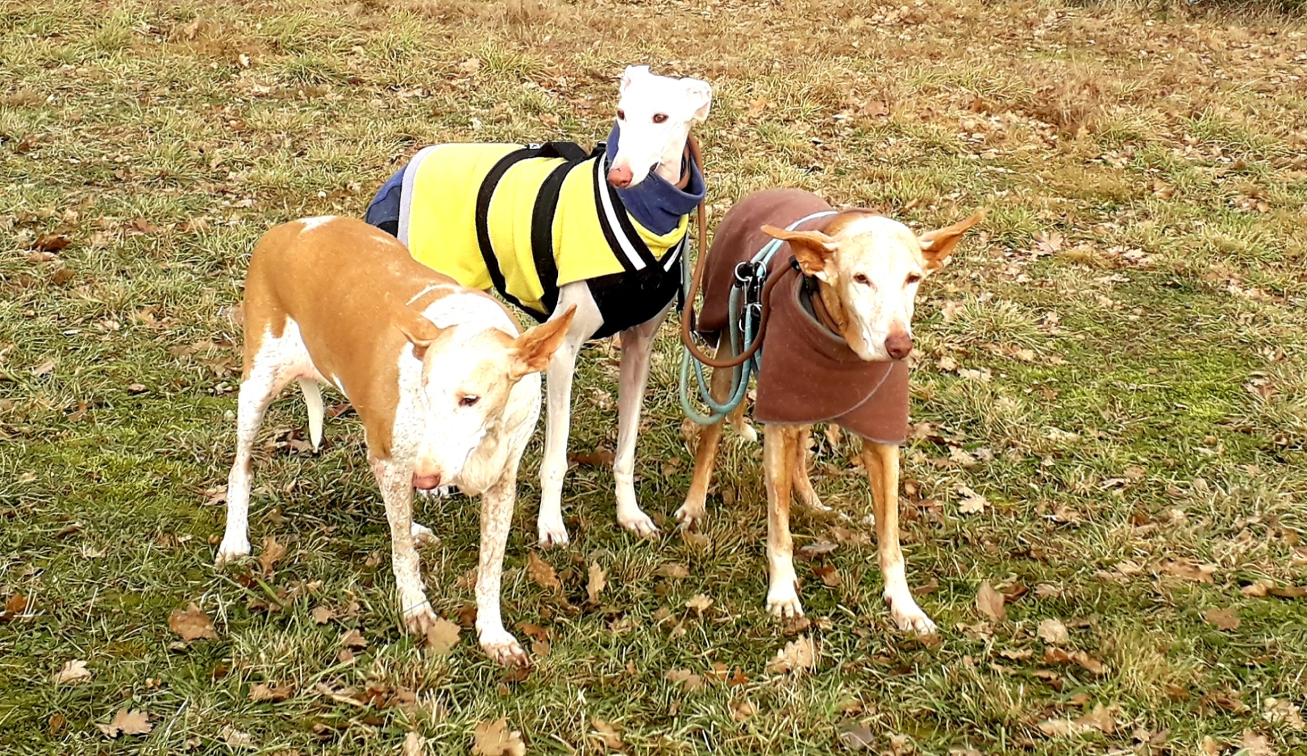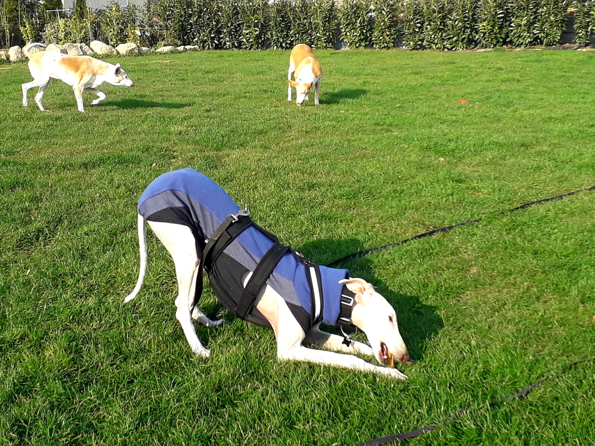 Wenn die Pflegemama sein Sicherheitsgeschirr hervorholt, steht er schon freudig da. Die flotten Spaziergänge im Rudel und auch mit der Pflegemama alleine, genießt er sehr und will richtig Tempo machen. Es kann aber auch passieren, dass er plötzlich in den Fluchtmodus verfällt. Der Auslöser kann ein unverhofftes Geräusch sein oder auch nur das jemand 100te von Meter hinter ihm geht.Bei Hundebegegnungen bleibt er gelassen und freundlich, manchmal auch freudig aufgeregt. Bei Begegnungen mit Menschengruppen, Wanderern, Reitern, Kinder, Radfahrer, Menschen hinter Büschen, Handwerker usw. zeigt er leichte Unsicherheit bis Angst und Panik. Das ist bei sicherer Führung aber gut händelbar. An der Leine läuft er am Ende des Spazierganges ganz gut, am Anfang macht sich die Energie eines jungen Galgos bemerkbar, da will er einfach laufen. Sein vorhandener Jagdtrieb lässt sich schon besser kontrollieren. Bei Katzen oder Hühner macht er keinen Salto mehr vor lauter Aufregung – dies war in der Anfangszeit so.