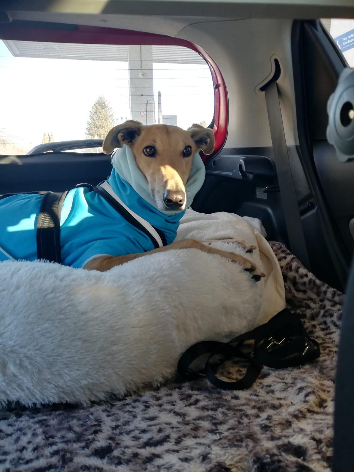 Autofahren liebt er. Wie ein Reh springt er in den Kofferraum und legt sich gleich entspannt hin.