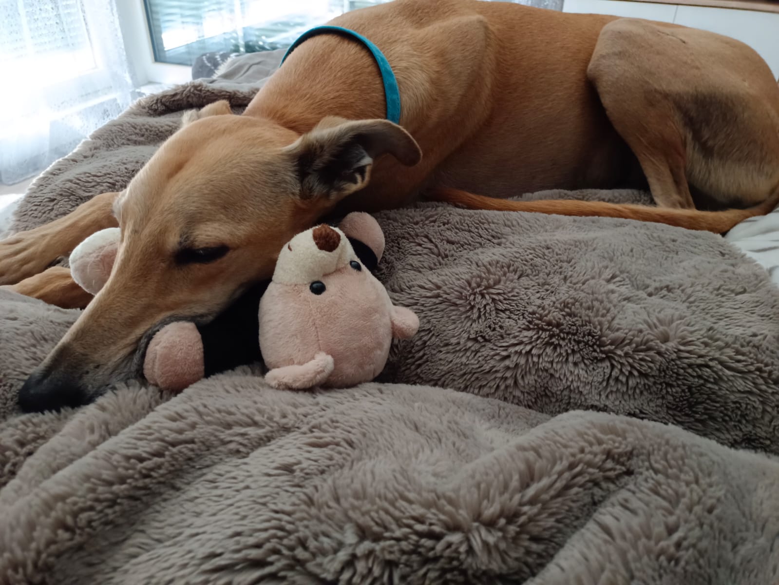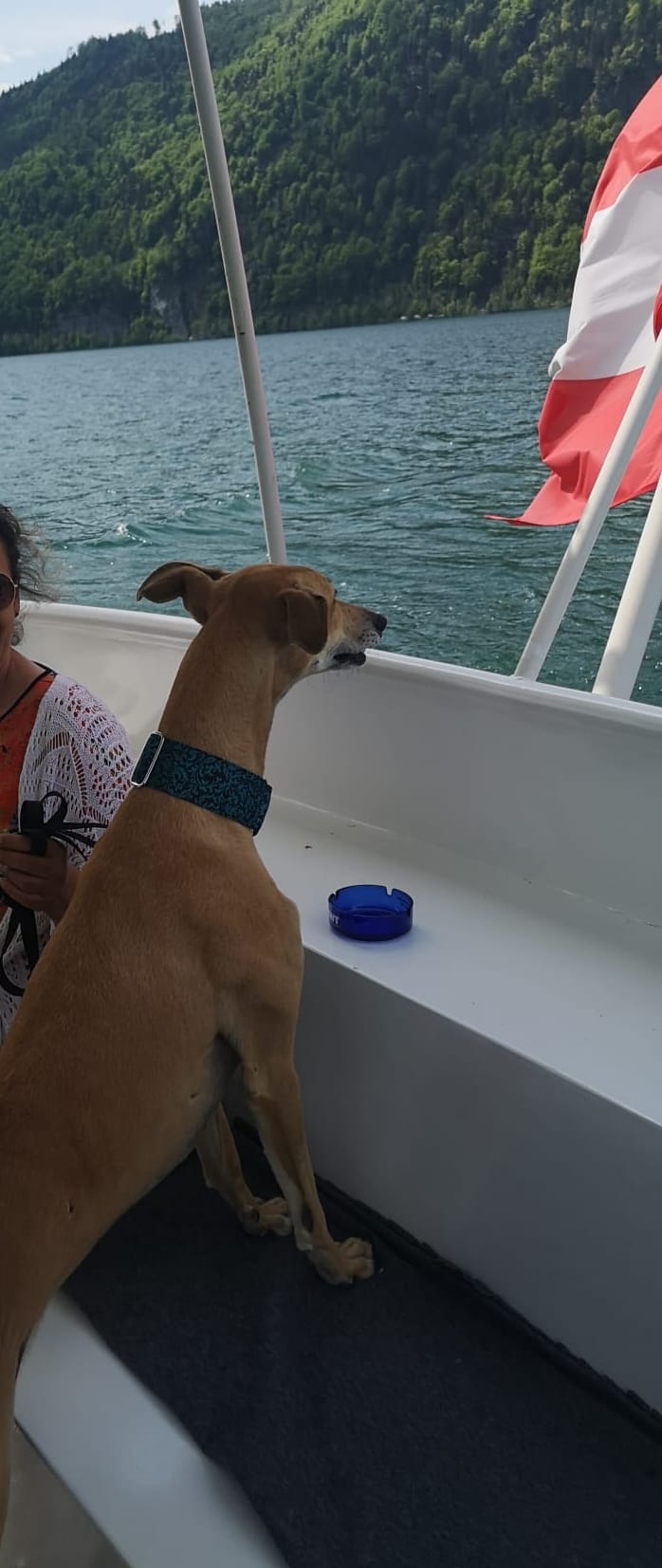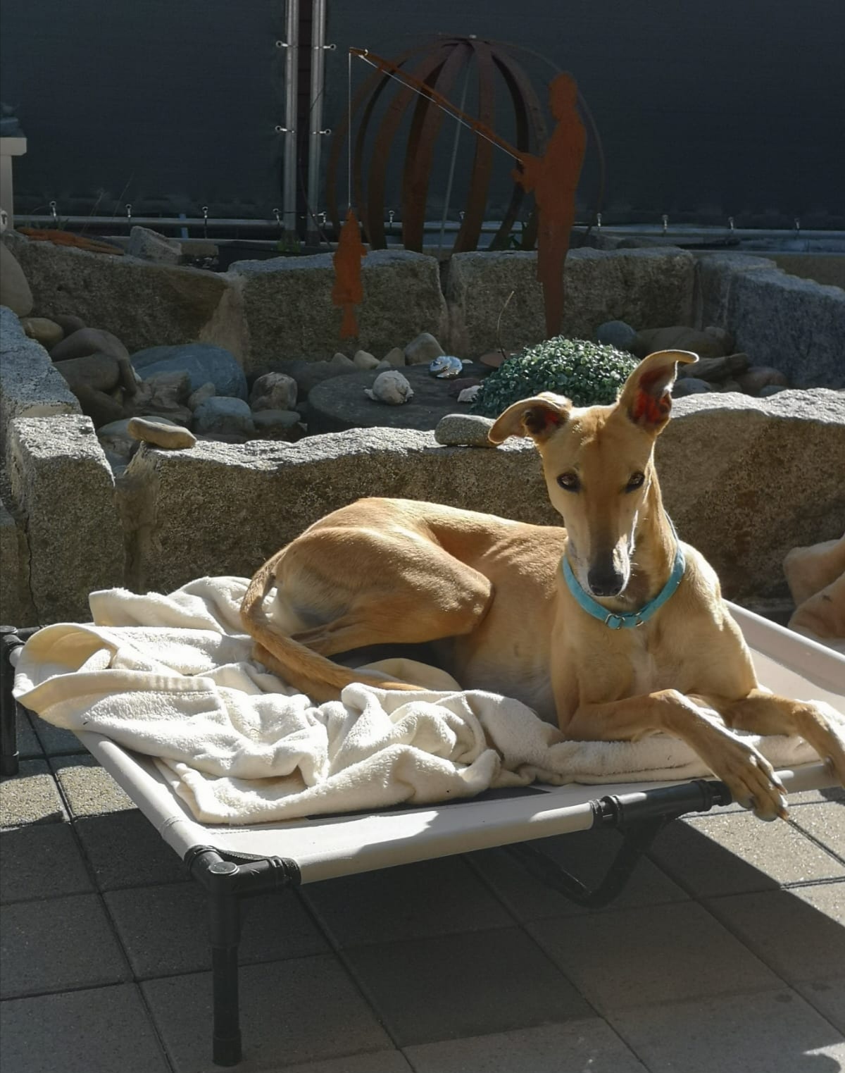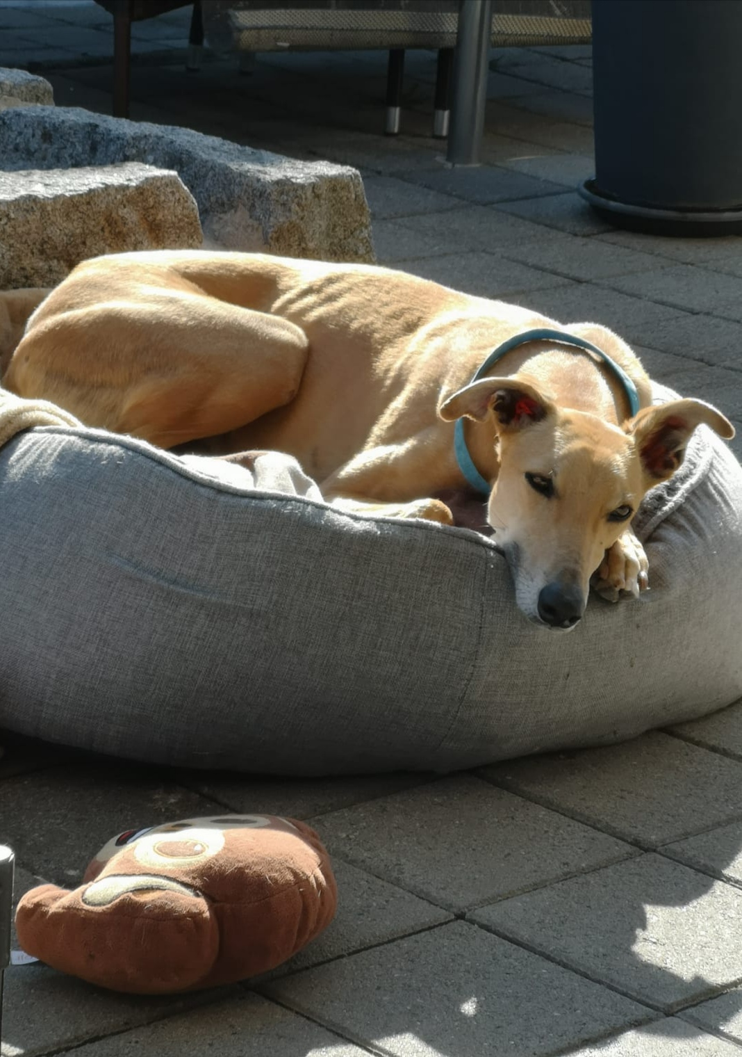 Kaleo ist der ideale Wohnmobilgalgo. Burgen besichtigen mit steilen Treppen, Schiffahrt geniessen, Skywalk begehen, Streetfood Festival durch die Nase ziehen - er geht tapfer überall mit. Neue Menschen kennen lernen, viele neue Hundebegegnungen - Kaleo ist trotz seiner Jugend nicht stürmisch. Sein Temperament zeigt er in der Hundewiese wenn er in einem atemberaubendem Tempo daherbrettert. Kaleo ist kein Einzelhund - er braucht unbedingt einen zweiten Galgo als Partner. Egal ob Männchen oder Weibchen - er versteht sich mit allen. Der Partner darf aber nicht dominant sein - Kaleo ist eher unterwürfig und wird im Rennspiel sonst als Hase auserkoren. Stubenrein, eigene Hauskatze, mit Hundepartner alleine bleiben, Cafebesuch - kein Problem. Die Kinder sollten aber nicht zu klein sein - eher im Teenageralter. Kleine Kinder sind ihm eher unheimlich. Er ist sehr gelehrig und lernt unheimlich schnell. Aber Achtung - ein Meisterdieb im Klauen von Essen.