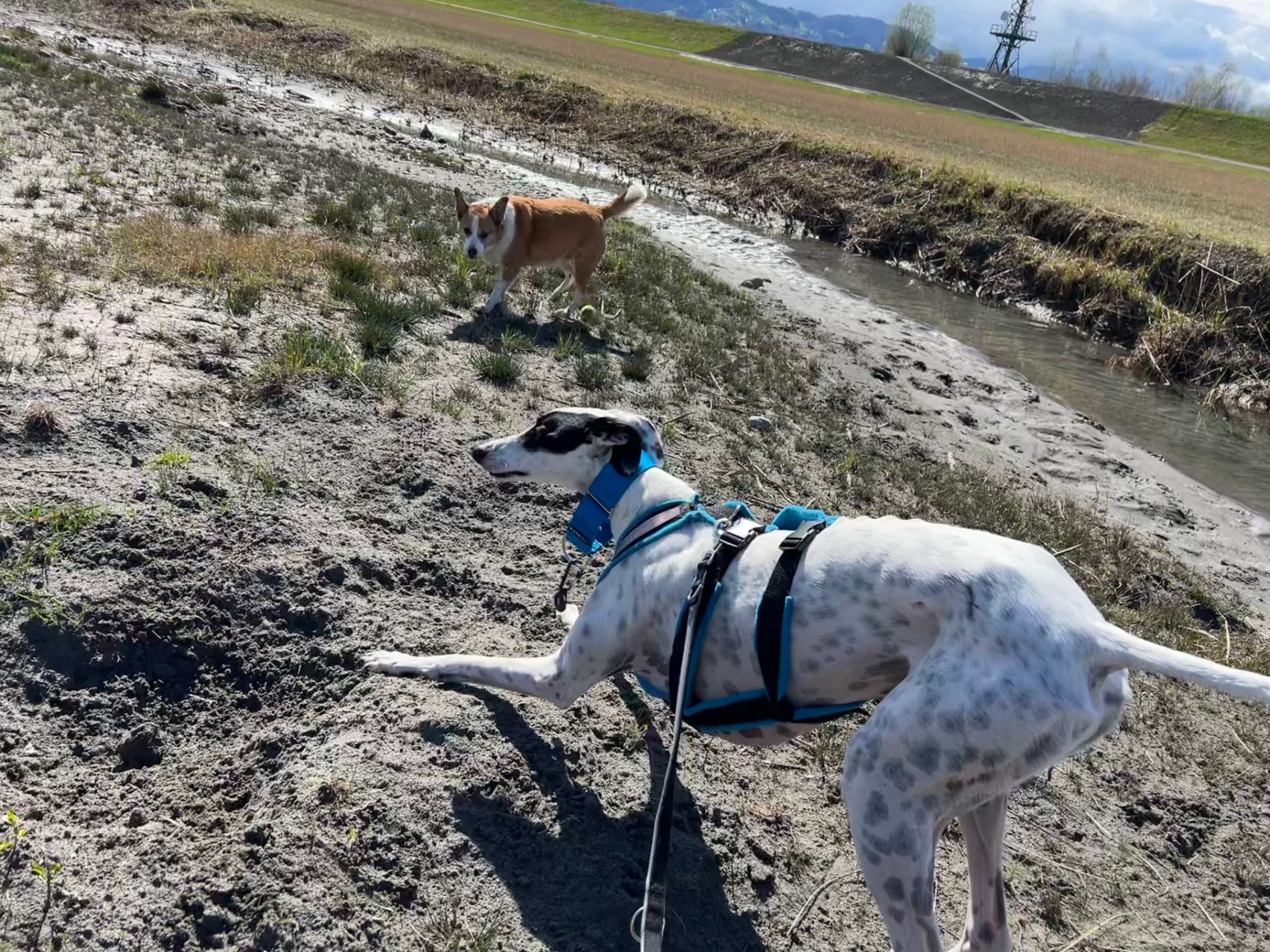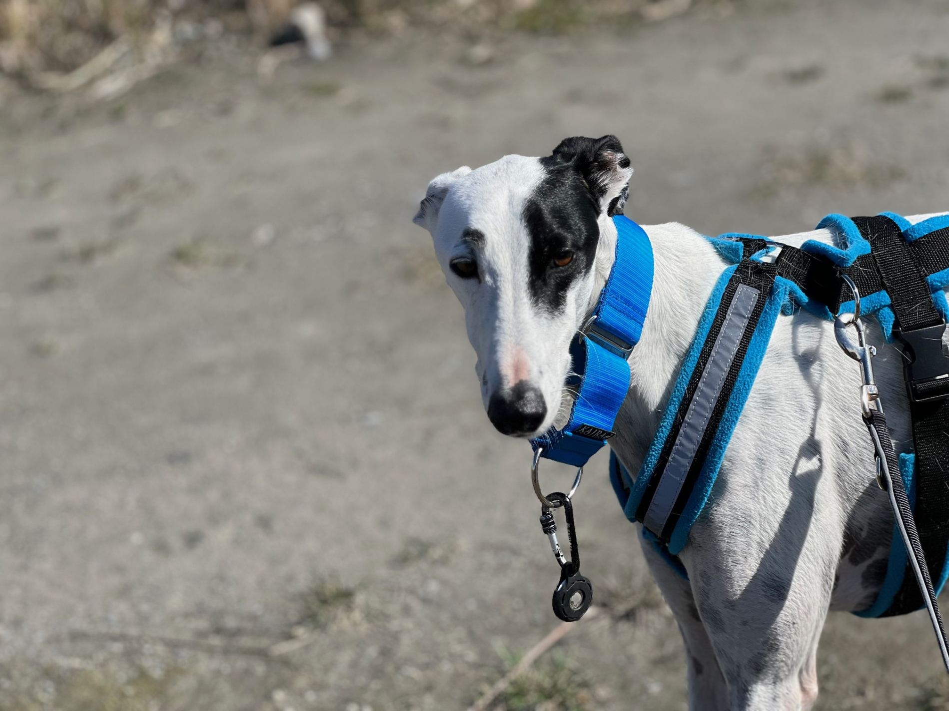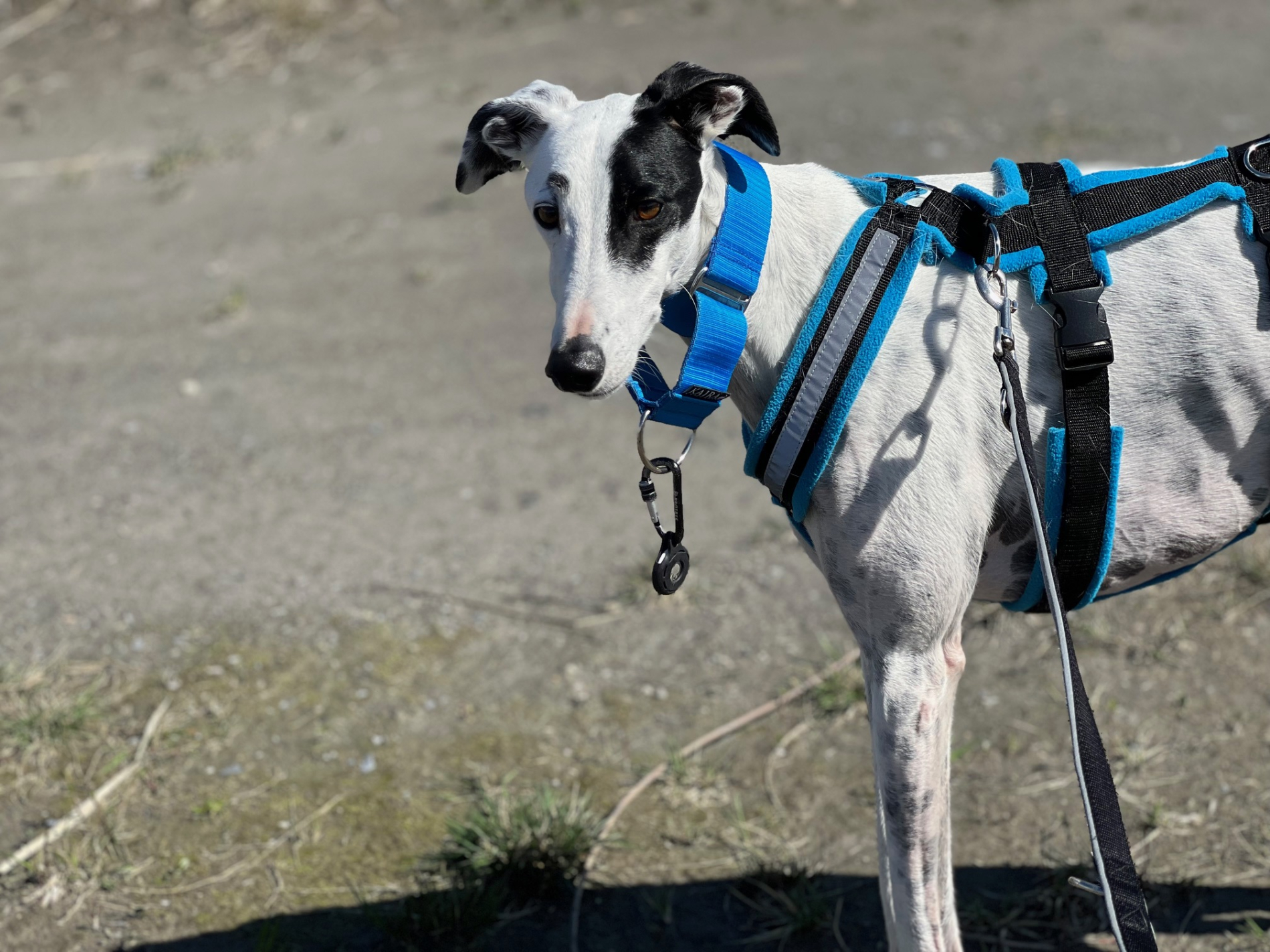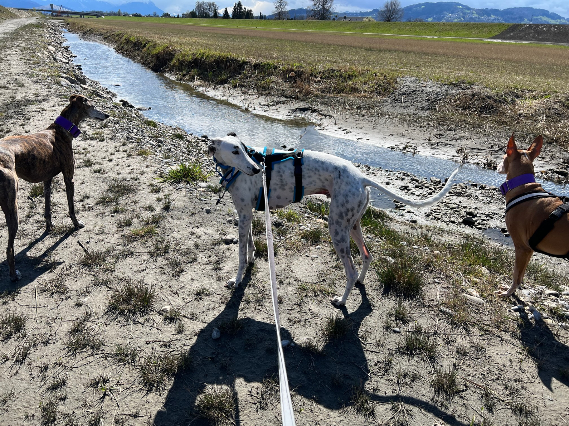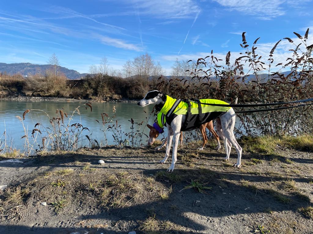 Außerhalb von Haus und Garten ist es leider ganz ein anders Thema. Weite Freiflächen ohne viele Leute und Verkehr gehen halbwegs, allerdings im Dorf mit normalen Verkehr ist Kareem sehr unsicher und hat die Rute oft bis zum Bauch eingeklemmt. Hier funktioniert es nur mit Doppelsicherung, alles andere ist zu gefährlich. Bei unerwarteten oder lauten Geräuschen oder auch manchmal wenn andere Leute entgegenkommen, kann es sein, dass Kareem einen Satz macht und weg will. Das kann ohne Doppelsicherung gefährlich ausgehen. Kareem braucht generell sehr lange bis er eine Bindung aufbaut. Da würde ein gemeinsames Hundetraining in der Hundeschule sehr helfen.