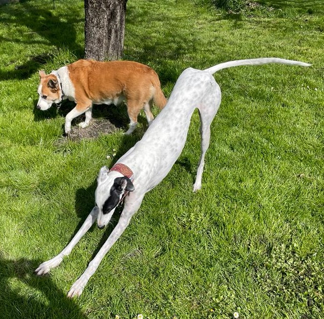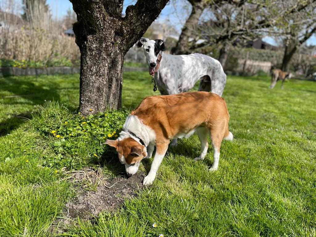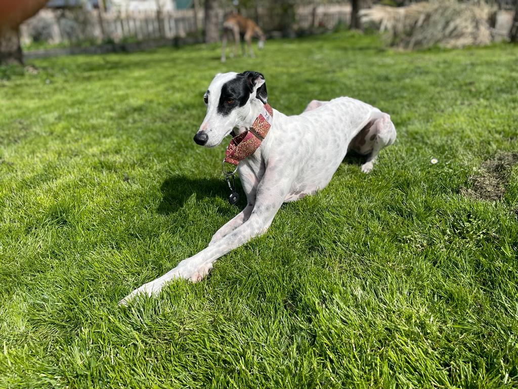 Kareem taut auf der Pflegestelle immer mehr auf. Im Garten ist er total fröhlich, spielt und rennt mit allen Hunden sehr gerne. Egal ob Windhunde oder andersrassige Besuchshunde, Hauptsache sie machen mit.