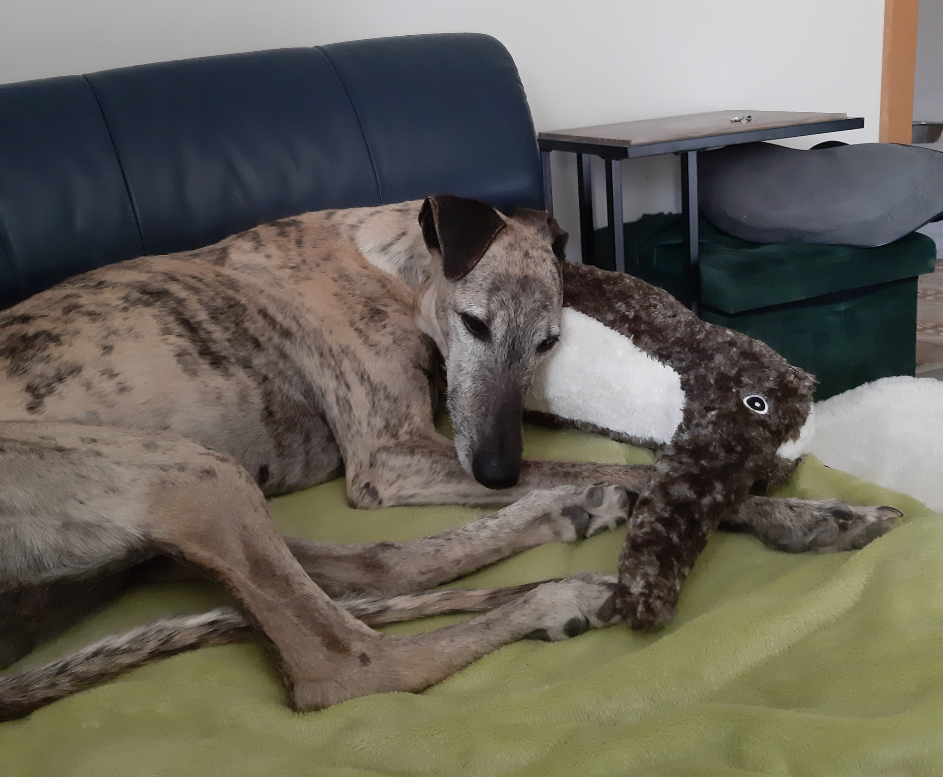 Piruleta, genannt „Letti“, ist nun seit zwei Wochen in Vorarlberg und hat sich schon super eingelebt. Sie ist gerne überall dabei und geht neue Situationen ganz entspannt an. Jeder wird von Letti freundlich und schwanzwedelnd begrüßt und auch Kinder mag sie gerne. Die hübsche Galgodame geht gerne mit zur Arbeit. Beim Spaziergang geht sie brav und aufmerksam an der Leine. Katzen findet sie schon interessant, macht aber derzeit keine großen Anstalten um ihnen nachzujagen. Piruleta ist sehr verschmust und genießt die Abende mit ihrer Pflegemama auf der Couch. Sie spielt auch schon eifrig mit ihrem Kuscheltier. Auch alleine bleiben funktioniert für ein paar Minuten schon ganz gut.
