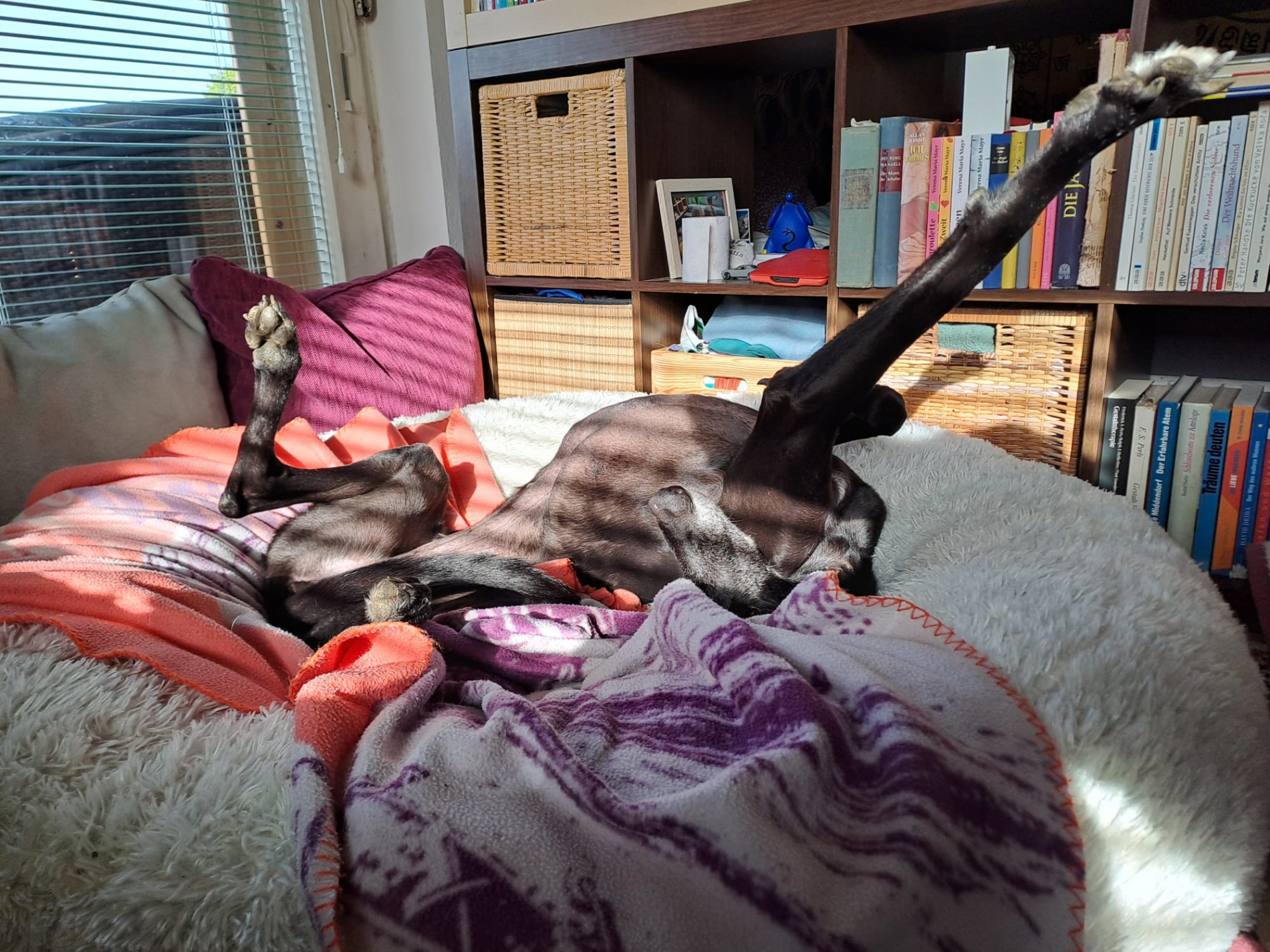 Kayli ist ein absoluter Rudelhund. Sie hat ihr ganzes Leben vermutlich vorrangig mit anderen Galgos verbracht. An die Aufmerksamkeit durch Menschen gewöhnt sie sich gerade erst. Man darf nicht vergessen, dass sehr viele dieser Hunde – obwohl in der Regel unglaublich sozial und menschenbezogen – die (geballte) Zuwendung und Aufmerksamkeit nicht kennen und sie für sie durchaus anstrengend und/oder auch angsteinflößend sein kann am Anfang. So ging es auch Kayli. Mittlerweile genießt sie das Kuscheln und Streicheln und auch die gelegentlichen Bussis (eigentlich eine totale Grenzüberschreitung, aber es geht einfach nicht Ohne…) scheinen sie nicht zu stören.
