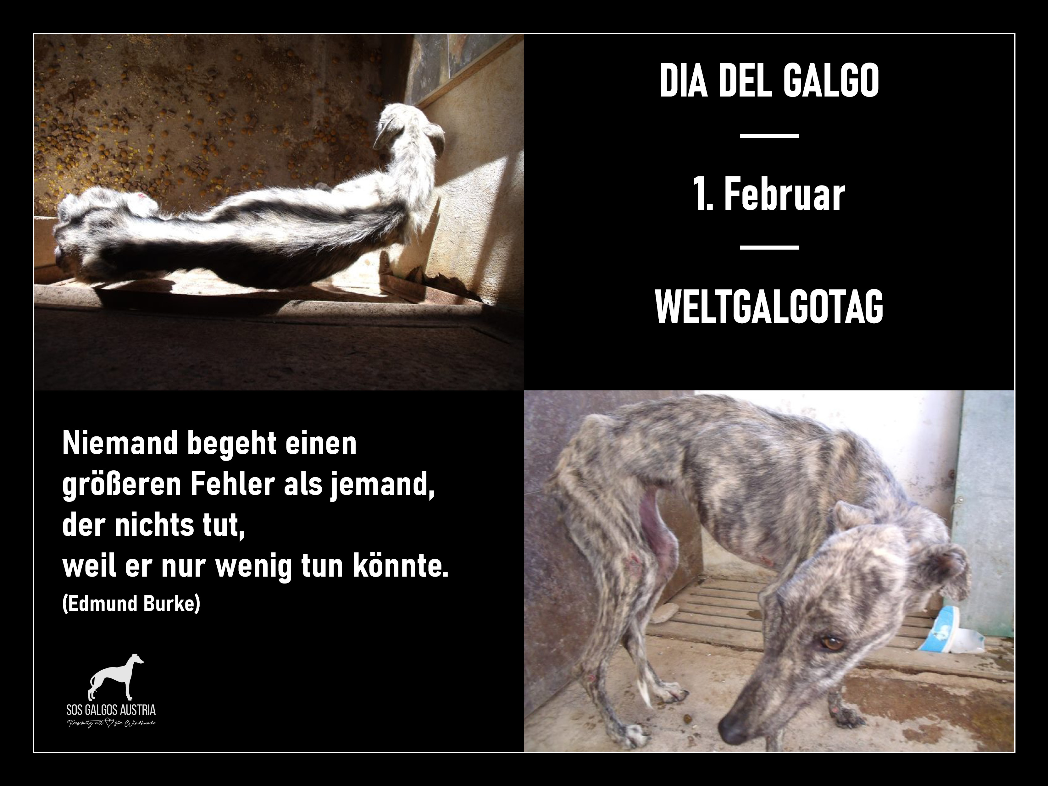 Zehntausende Galgos und Podencos werden am Ende der Jagdsaison – der 1. Februar - ihrem traurigen Schicksal überlassen! Und jedes Jahr quellen die spanischen Tierheime über von aufgefundenen, abgegebenen zum Teil schwer verletzten, traumatisierten Windhunden. Dieses Jahr ist es so schlimm, dass einige Tierheime keine Tiere mehr aufnehmen können – sie sind übervoll!!!! Sie sind am Limit mit Platz, Zeit und kämpfen so oder so immer mit Geldnöten. Was diese Tierschützer vor Ort erleben ist grausam – sie kämpfen an vorderster Front um die Tiere. Das Leid, den Schmerz der Tiere - immer in dem Wissen – sie kämpfen gegen Windmühlen. Ihr einziger Rückhalt ist das Wissen – wir alle zusammen versuchen ihnen so gut es geht mit Spenden aller Art den Rücken zu stärken. Andere Menschen darauf aufmerksam machen und die Regierung in Spanien mit Protestmärschen zum Handeln zu bewegen.