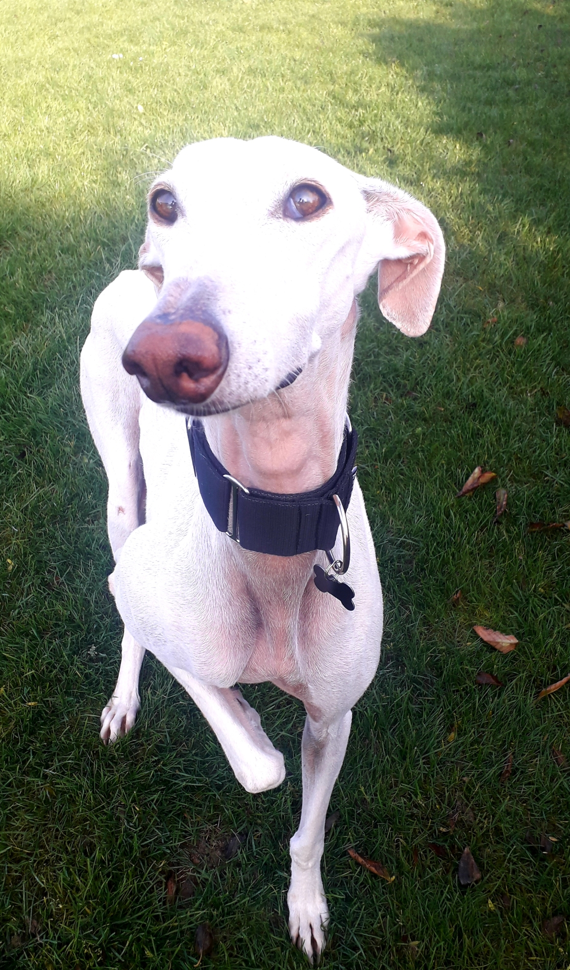 Wenn die Pflegemama sein Sicherheitsgeschirr hervorholt, steht er schon freudig da. Die flotten Spaziergänge im Rudel und auch mit der Pflegemama alleine, genießt er sehr und will richtig Tempo machen. Es kann aber auch passieren, dass er plötzlich in den Fluchtmodus verfällt. Der Auslöser kann ein unverhofftes Geräusch sein oder auch nur das jemand 100te von Meter hinter ihm geht.Bei Hundebegegnungen bleibt er gelassen und freundlich, manchmal auch freudig aufgeregt. Bei Begegnungen mit Menschengruppen, Wanderern, Reitern, Kinder, Radfahrer, Menschen hinter Büschen, Handwerker usw. zeigt er leichte Unsicherheit bis Angst und Panik. Das ist bei sicherer Führung aber gut händelbar. An der Leine läuft er am Ende des Spazierganges ganz gut, am Anfang macht sich die Energie eines jungen Galgos bemerkbar, da will er einfach laufen. Sein vorhandener Jagdtrieb lässt sich schon besser kontrollieren. Bei Katzen oder Hühner macht er keinen Salto mehr vor lauter Aufregung – dies war in der Anfangszeit so.