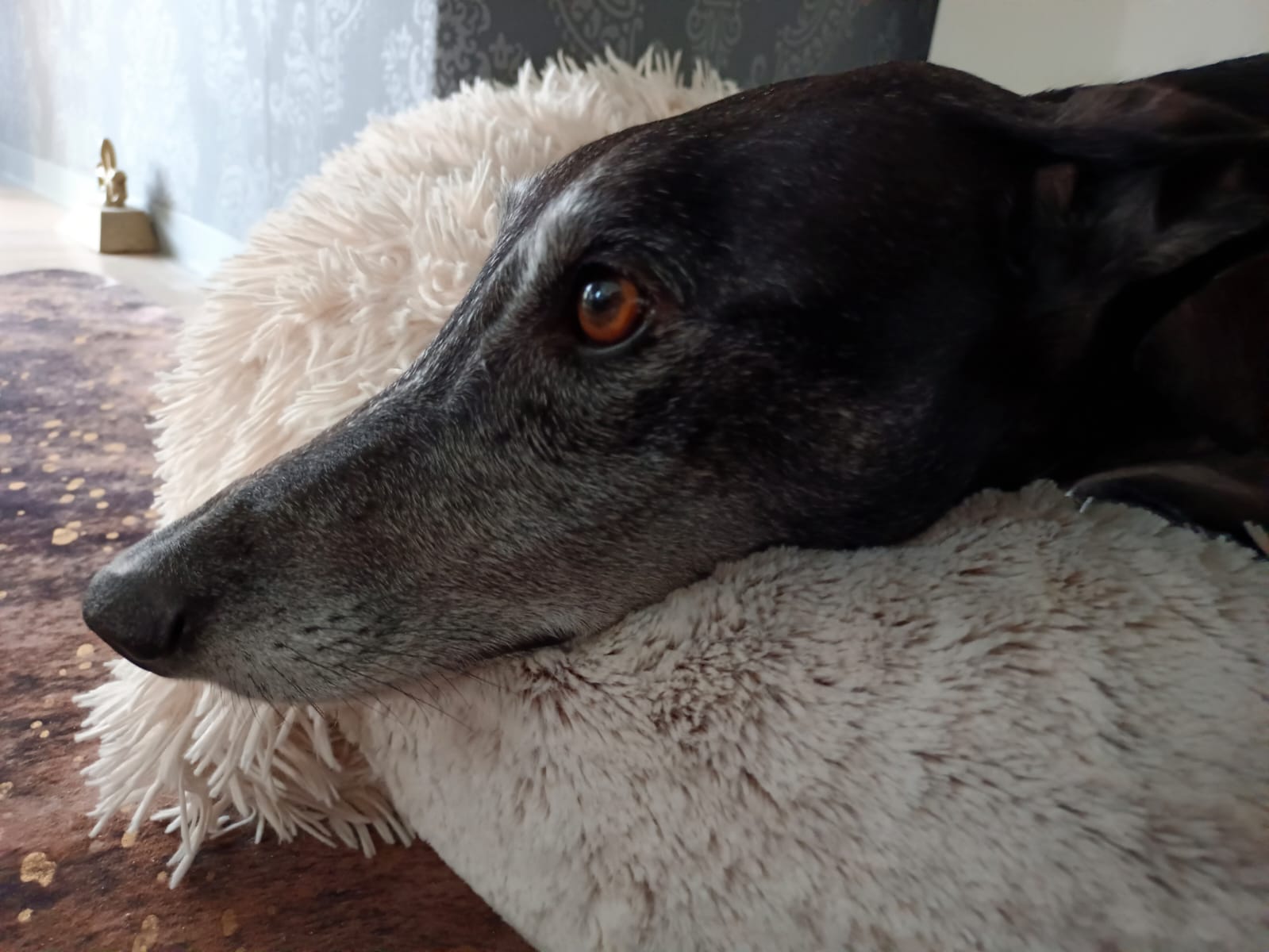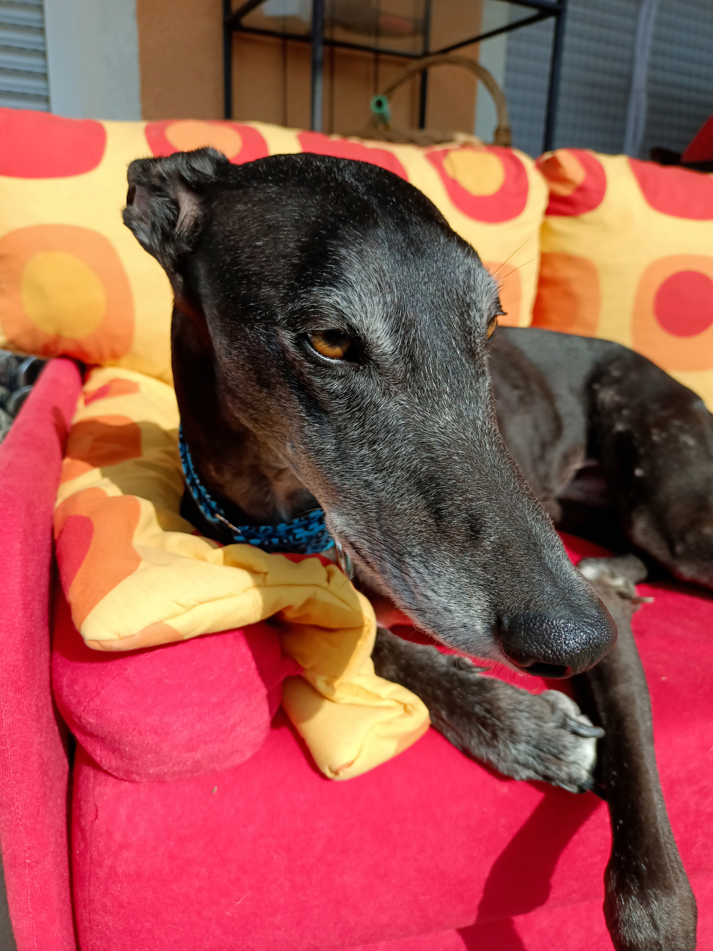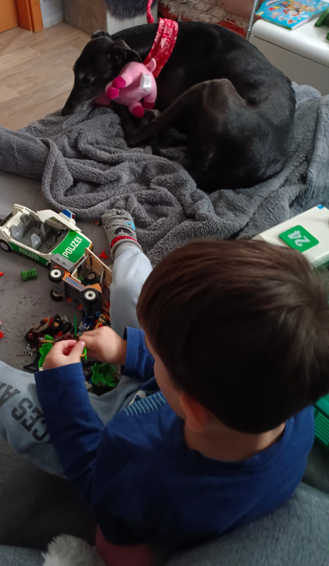 Ab und zu hat Luigi seine 5 verrückten Galgominuten. Dann schüttelt er sein Stofftier im Körbchen oder im Garten. Wenn es an der Haustüre klingelt bellt er, hört aber sofort auf wenn man aufsteht um den Besuch reinzulassen. Dann wird der Besuch, ob gross oder klein, langsam und freundlich begrüsst.