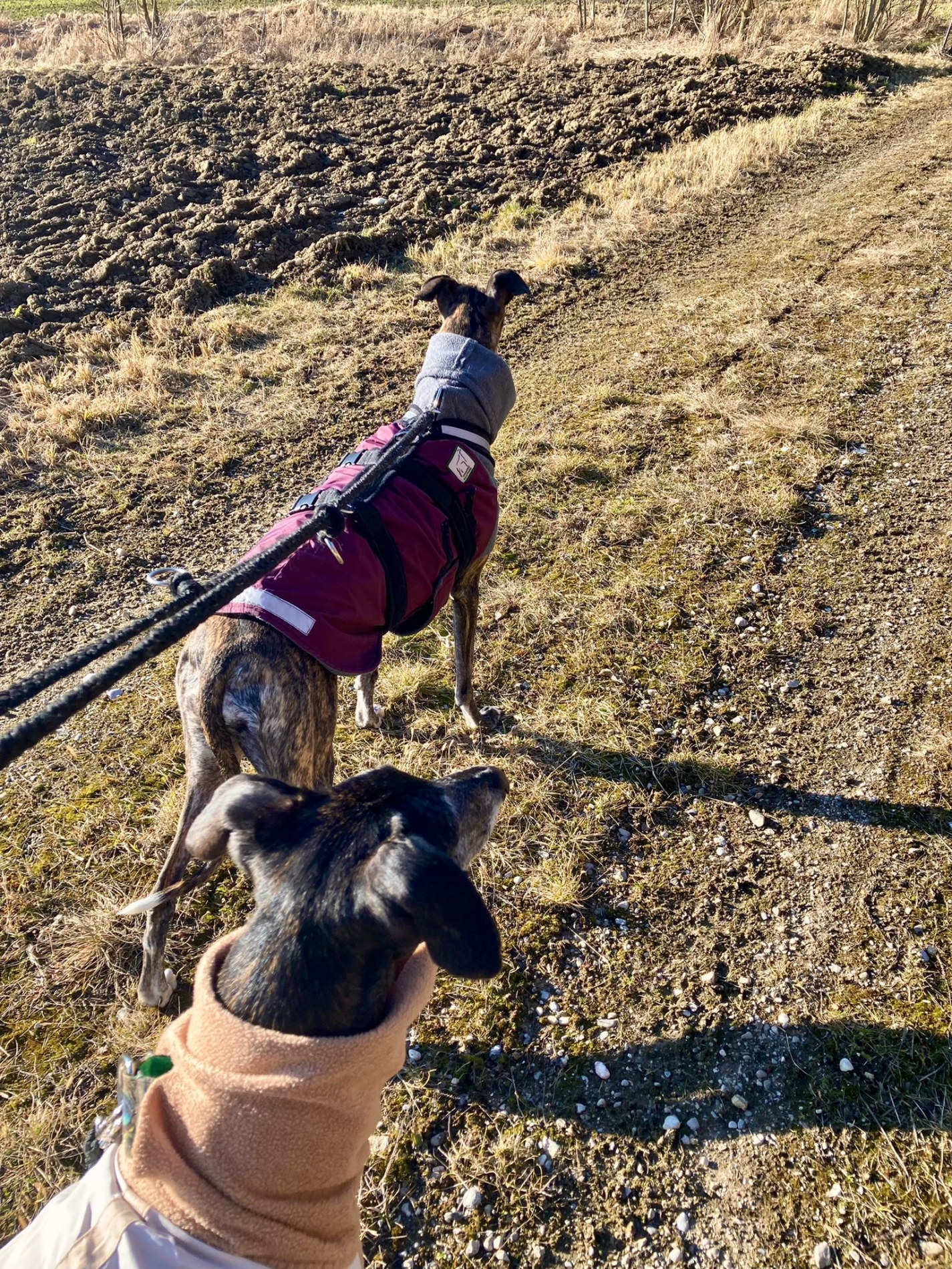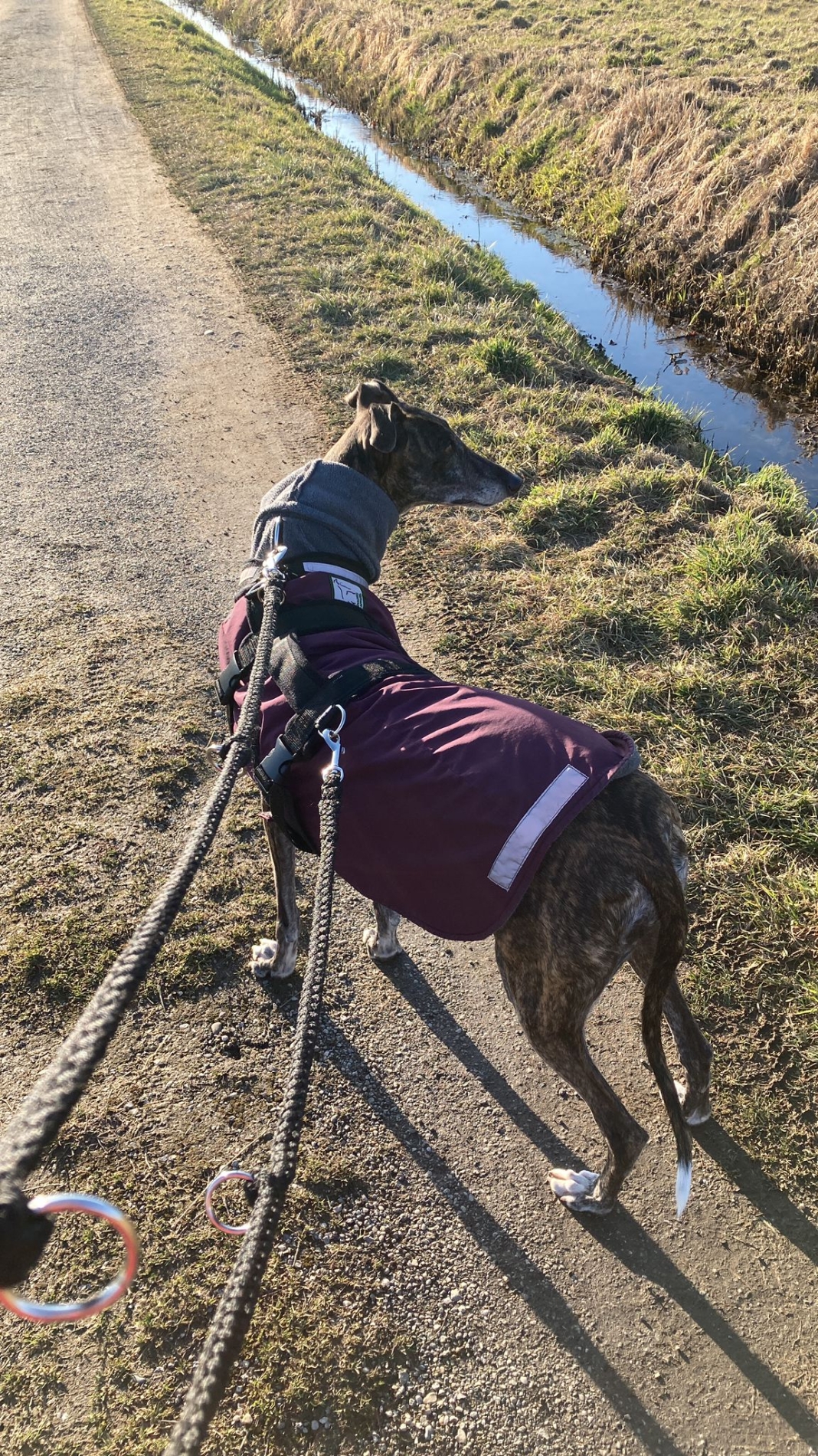 Draußen ist sie aufmerksam und ruhig an der Leine, keinesfalls panisch, also wirklich leicht zu führen. Rehe und Hasen sind interessant, aber sie wird nicht unruhig und zieht auch nicht an der Leine.