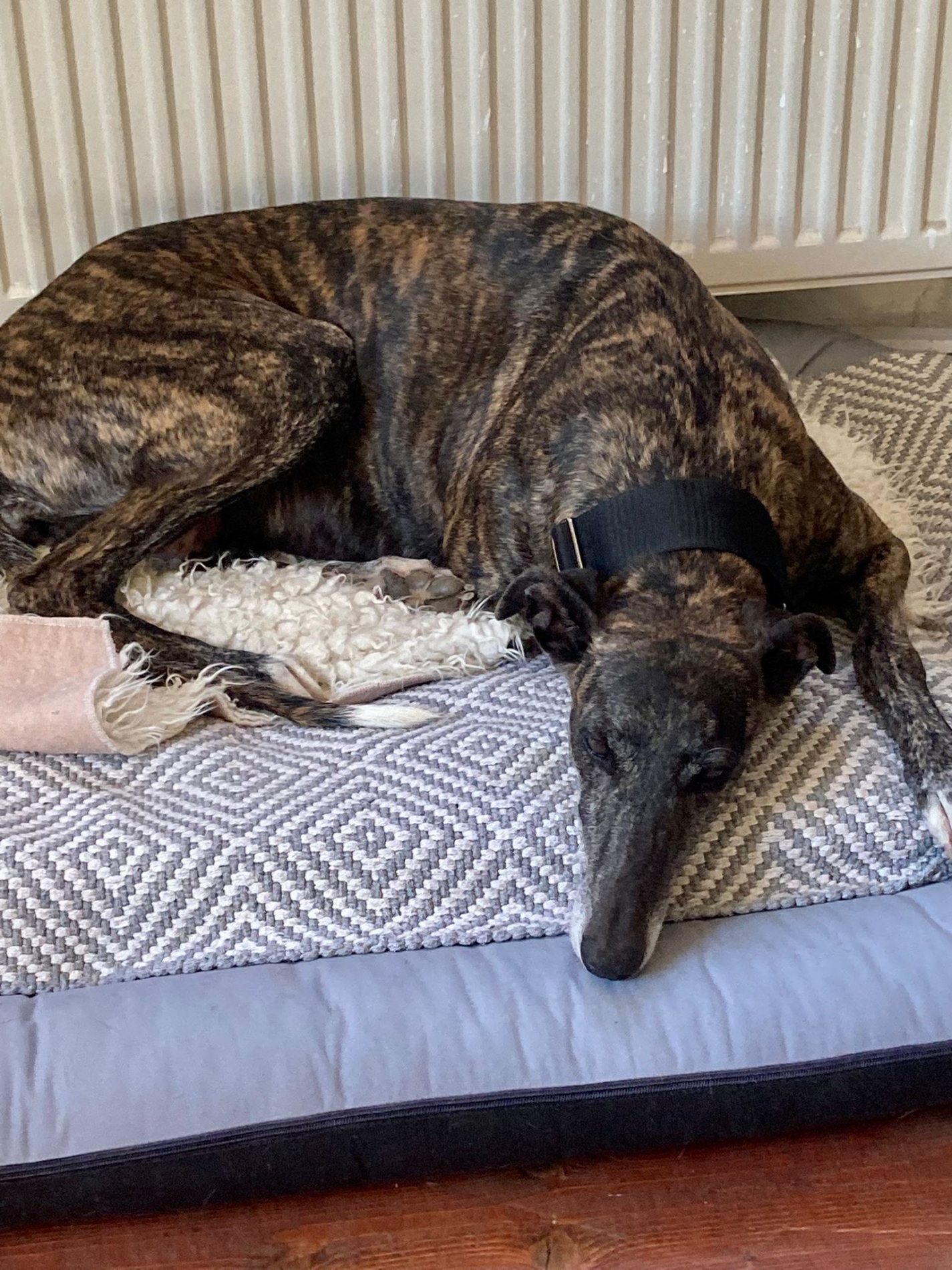 Man sieht, dass sie langsam offensiver wird und auftaut. Spielen mit anderen Hunden oder gar mit Menschen geht noch gar nicht, allerdings läuft sie gern schon mal im Garten gemeinsam mit der Pflegeschwester mit und kommt da ein bisschen aus sich heraus. Die Nacht schläft sie ruhig und entspannt neben der Pflegemama und wenn sie grad ganz mutig ist, holt sie sich auch ihre Streichelhand mit der Pfote. Auch das eine oder andere Spielzeug der Enkelin oder Socken landen mal in ihrem „Nest“ - sie zerstört sie nicht, sie sammelt sie nur.
