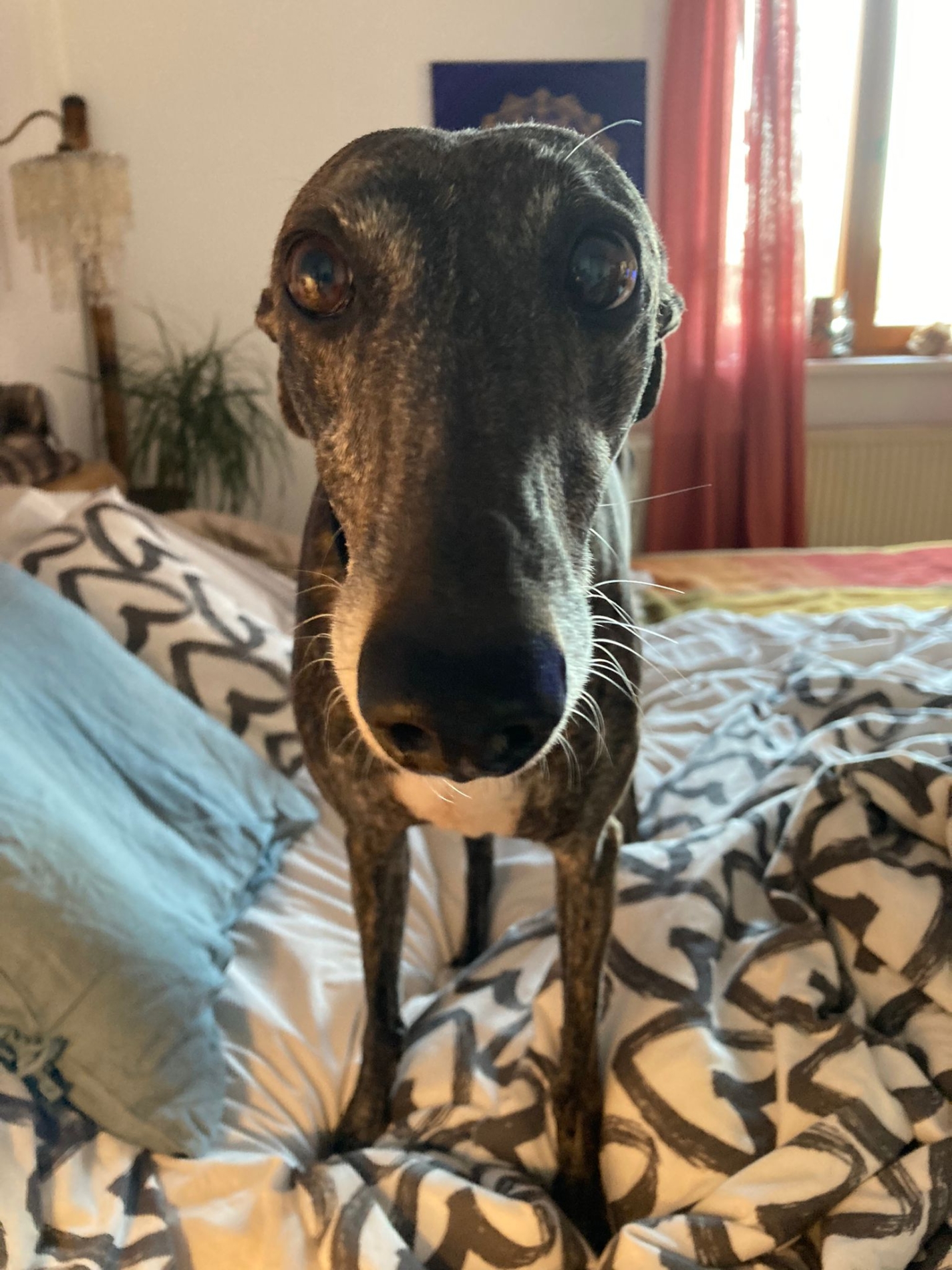 Kenya ist eine ausgesprochen ruhige und sanfte Galga und absolut stubenrein. Sie ist sozial mit Hunden und Katzen, allerdings noch in ihrer Zurückhaltung gefangen.