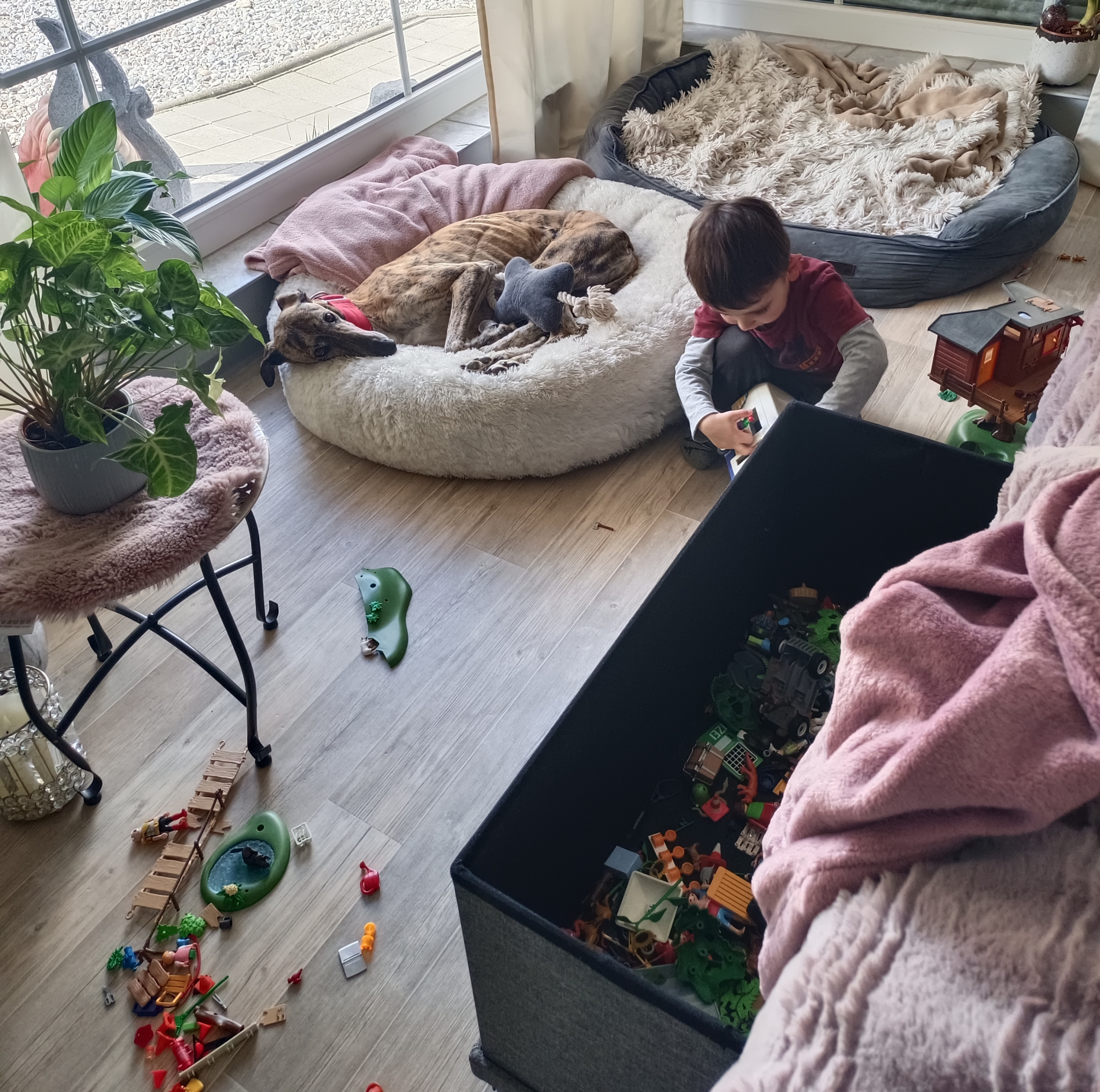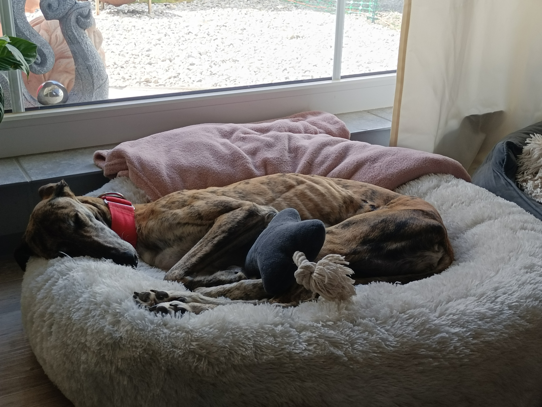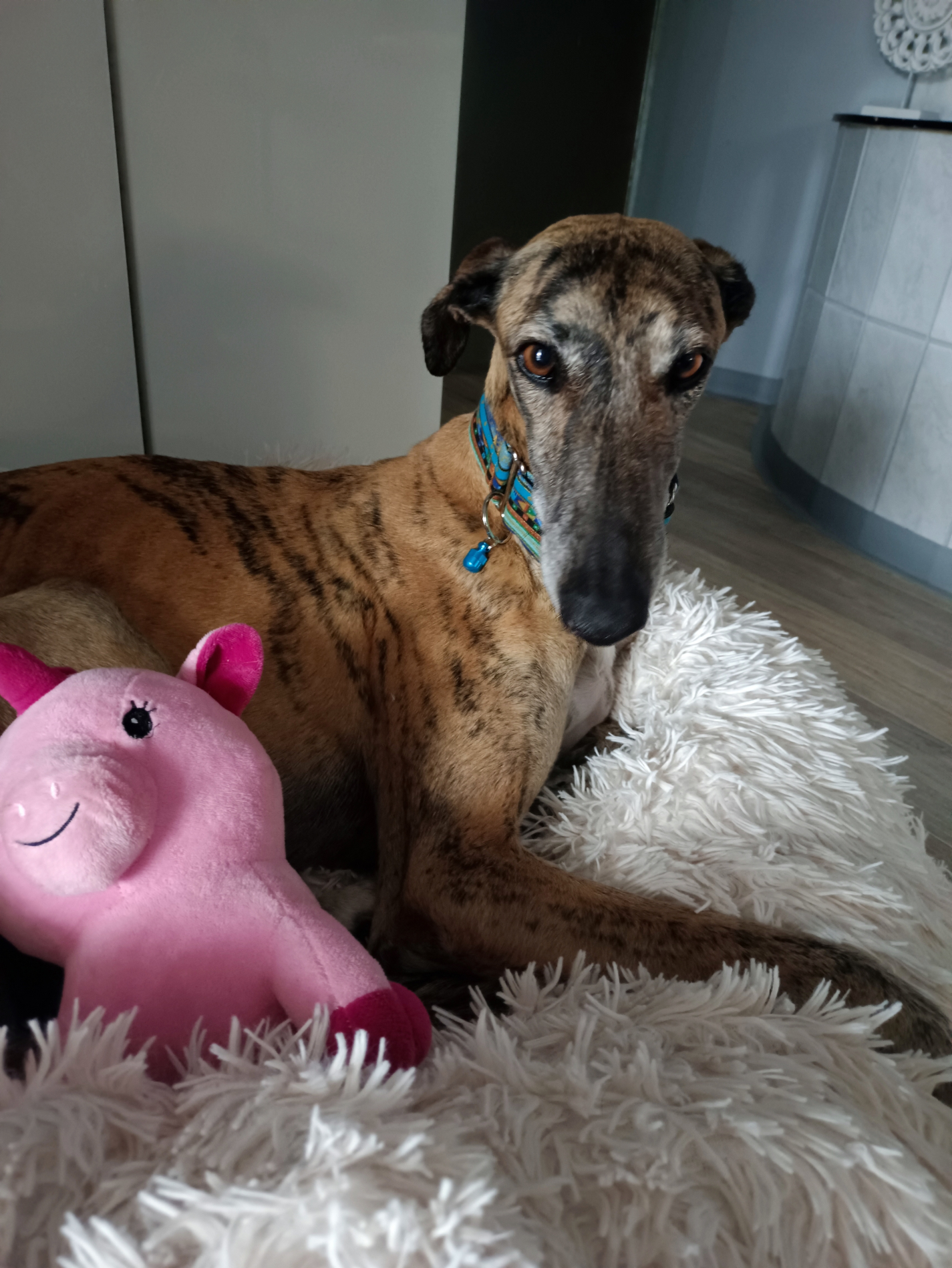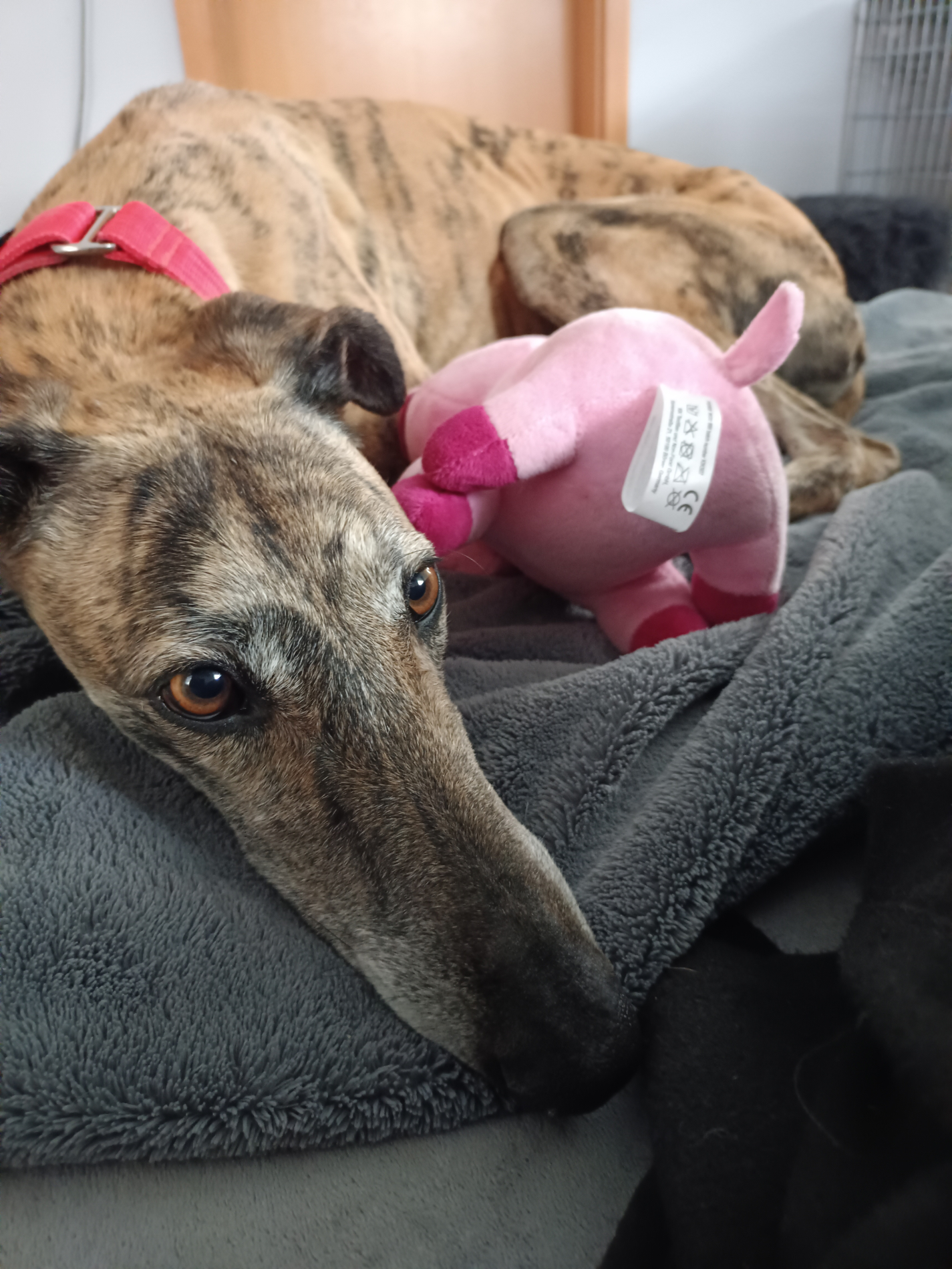 Kirana liebt Plüschtiere im Garten werfen oder auch mit ins Körbchen nehmen. Grosse Kissen von der Couch landen wundersamerweise immer wieder in ihrem Körbchen. Sie ist eine lustige, fröhliche Galga die auch als Einzelprinzessin glücklich werden würde. Sie bindet sich schnell an ihre Bezugspersonen.