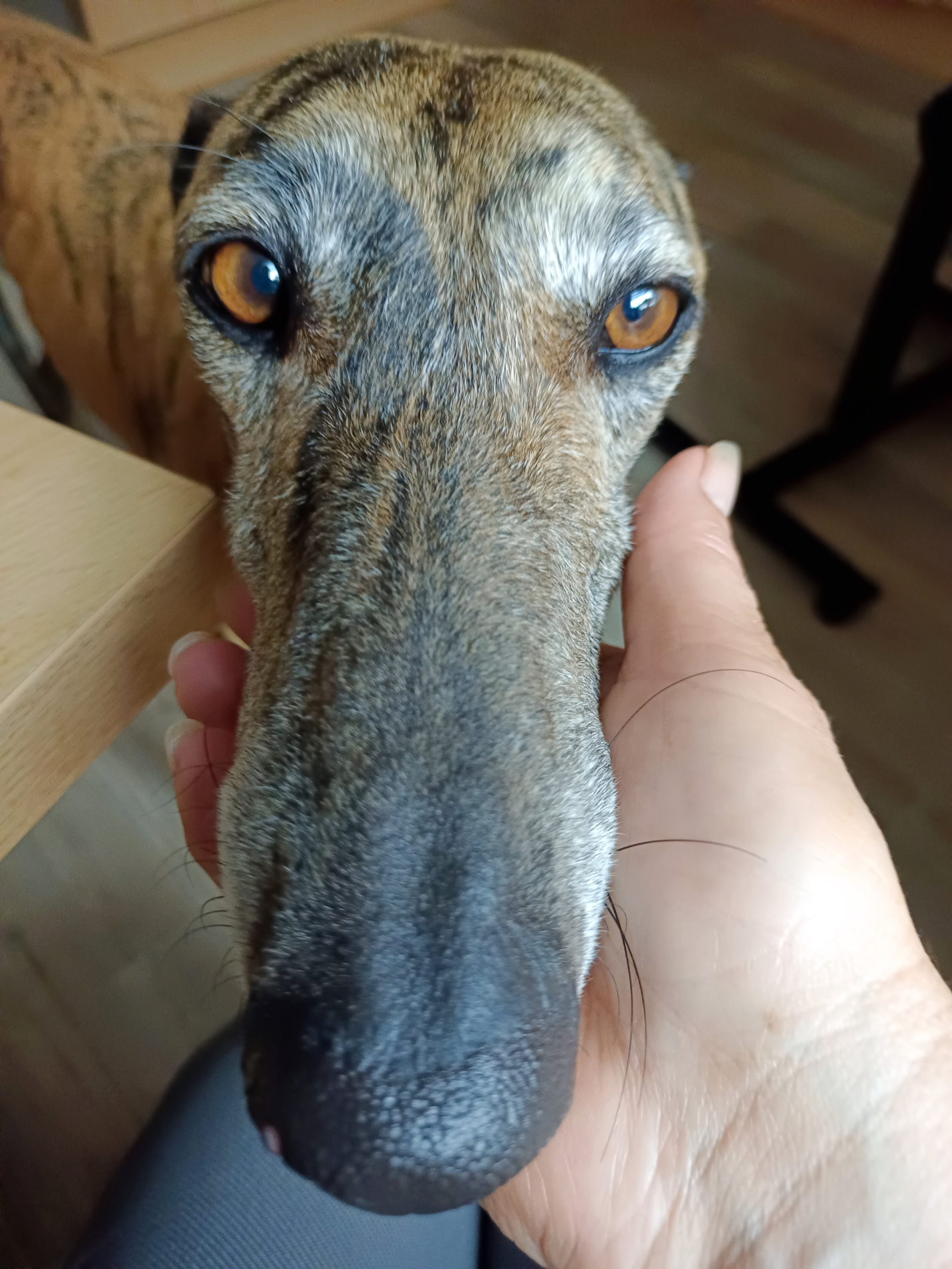 Ihre Unsicherheit wenn Besuch kommt zeigt sich im Bellen ( ein sehr tiefes) und sich zurückziehen. Wird sie nicht beachtet, kommt Kirana langsam her, die Neugier siegt dann doch. Der Pflegepapa wird nach den ersten Tagen Eingewöhnung schon freudig begrüsst.