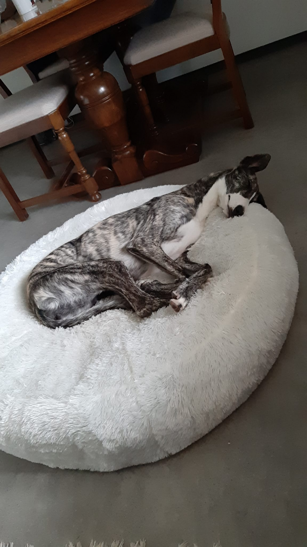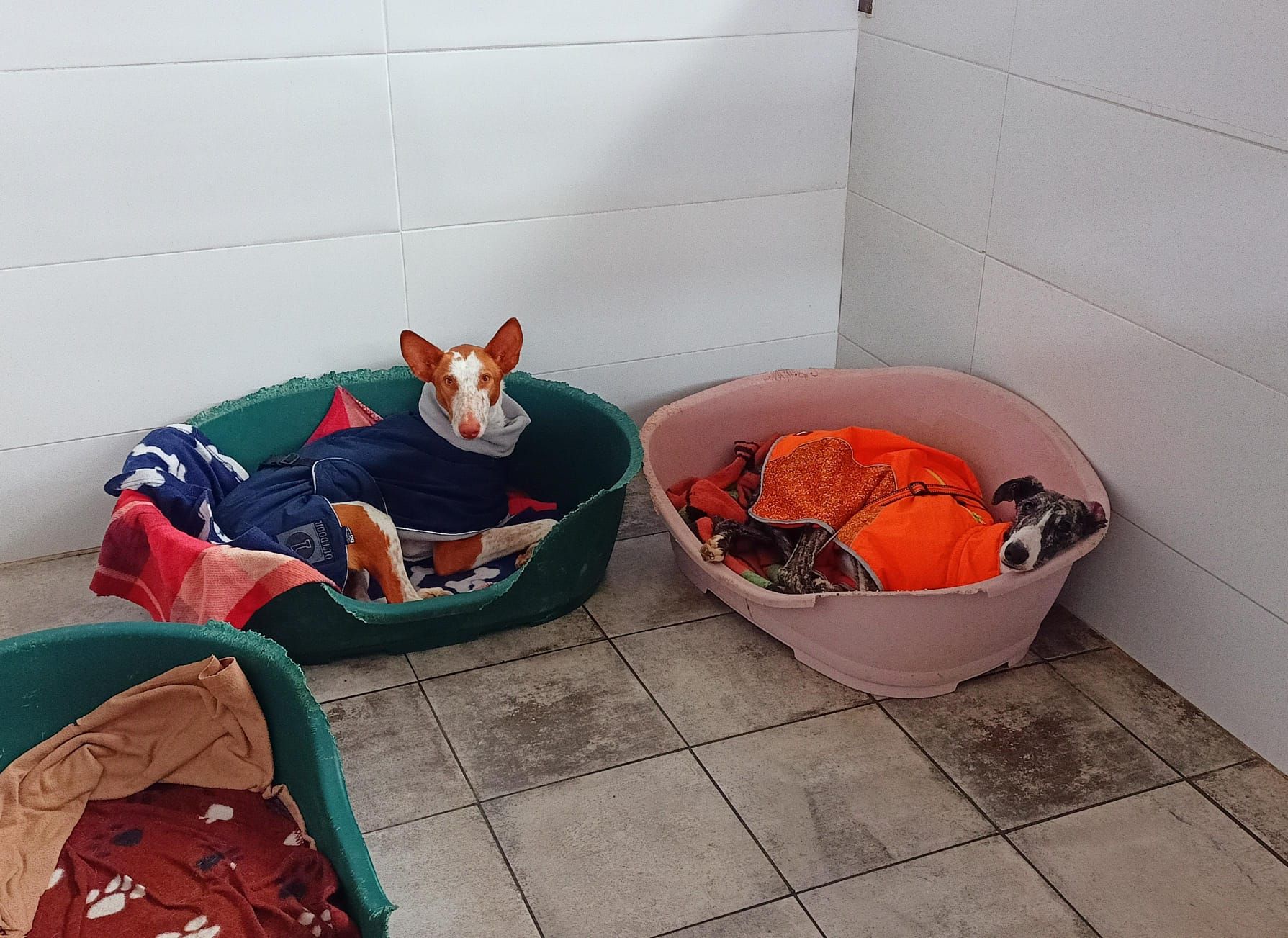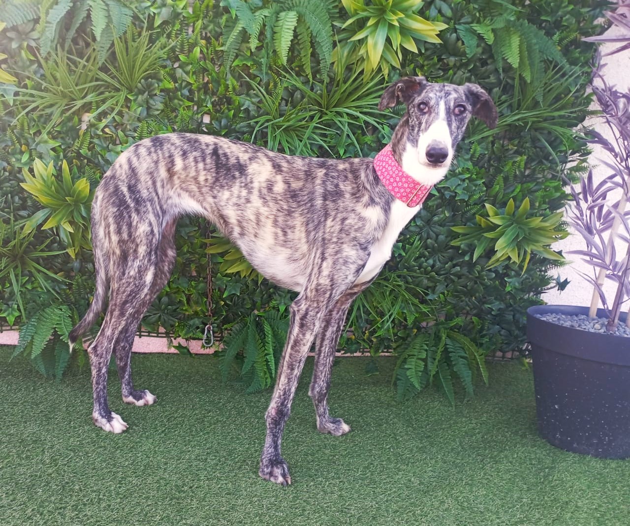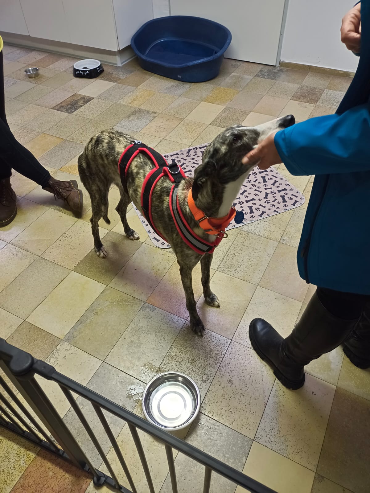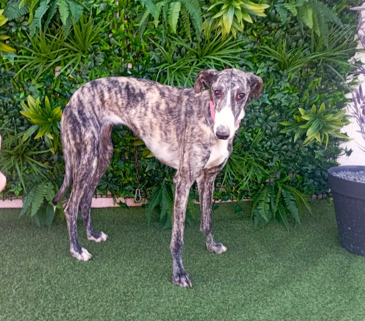 Biri ist eine ruhige und liebe Galga. Am ersten Tag schien sie unsicherer zu sein, aber sie hat sich sehr schnell an das Tierheim gewöhnt, und jetzt verhält sie sich wie ein ruhiger und entspannter Windhund. Wenn sich jemand ihrem Zwinger nähert, steht sie freundlich auf, um Hallo zu sagen, ohne Angst. Mit anderen Hunden ist sie brav, gesellig und unterwürfig, nicht dominant. Beim Katzentest wirkt sie entspannt und ruhig.