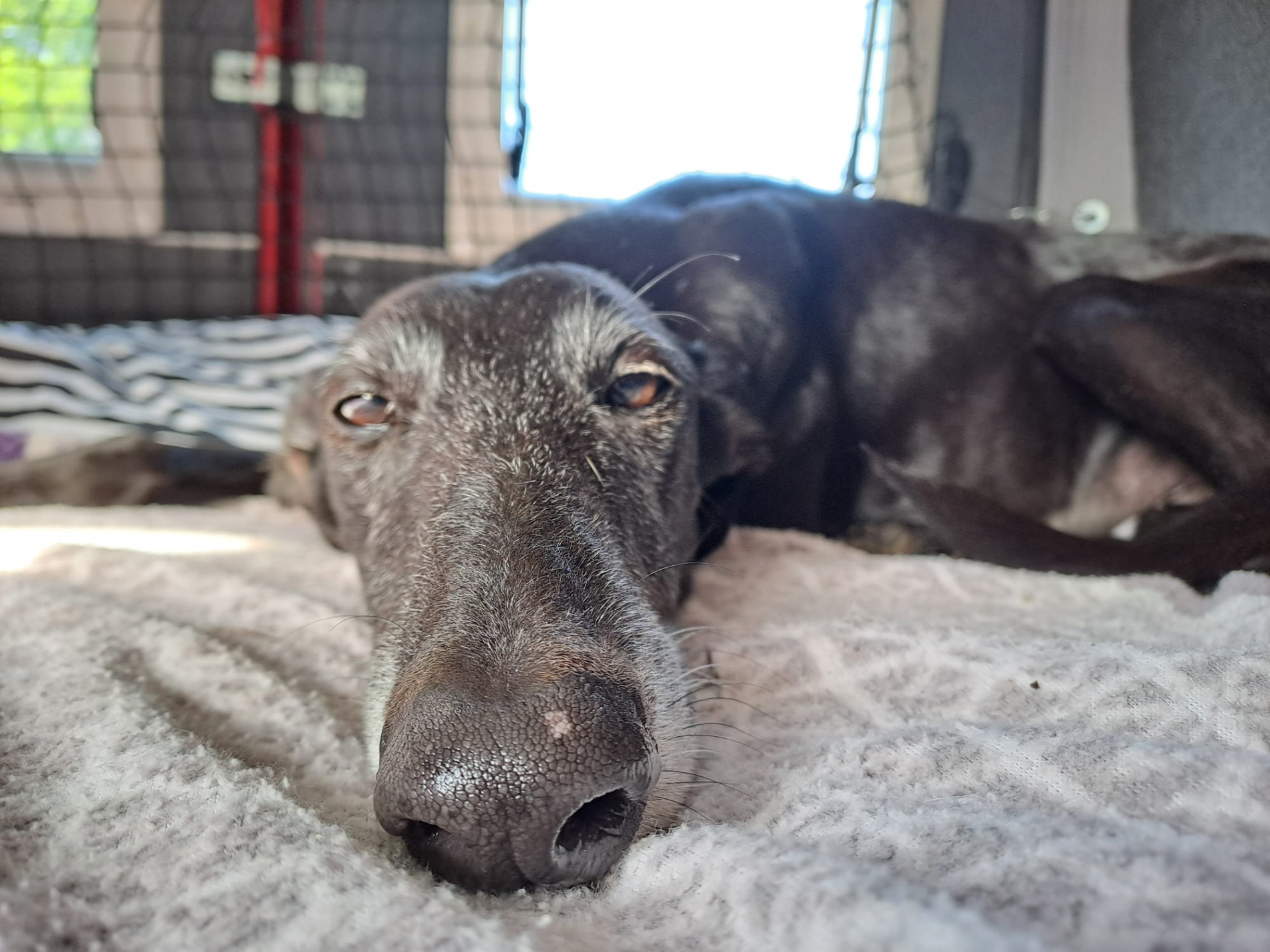 Kayli ist ein absoluter Rudelhund. Sie hat ihr ganzes Leben vermutlich vorrangig mit anderen Galgos verbracht. An die Aufmerksamkeit durch Menschen gewöhnt sie sich gerade erst. Man darf nicht vergessen, dass sehr viele dieser Hunde – obwohl in der Regel unglaublich sozial und menschenbezogen – die (geballte) Zuwendung und Aufmerksamkeit nicht kennen und sie für sie durchaus anstrengend und/oder auch angsteinflößend sein kann am Anfang. So ging es auch Kayli. Mittlerweile genießt sie das Kuscheln und Streicheln und auch die gelegentlichen Bussis (eigentlich eine totale Grenzüberschreitung, aber es geht einfach nicht Ohne…) scheinen sie nicht zu stören.