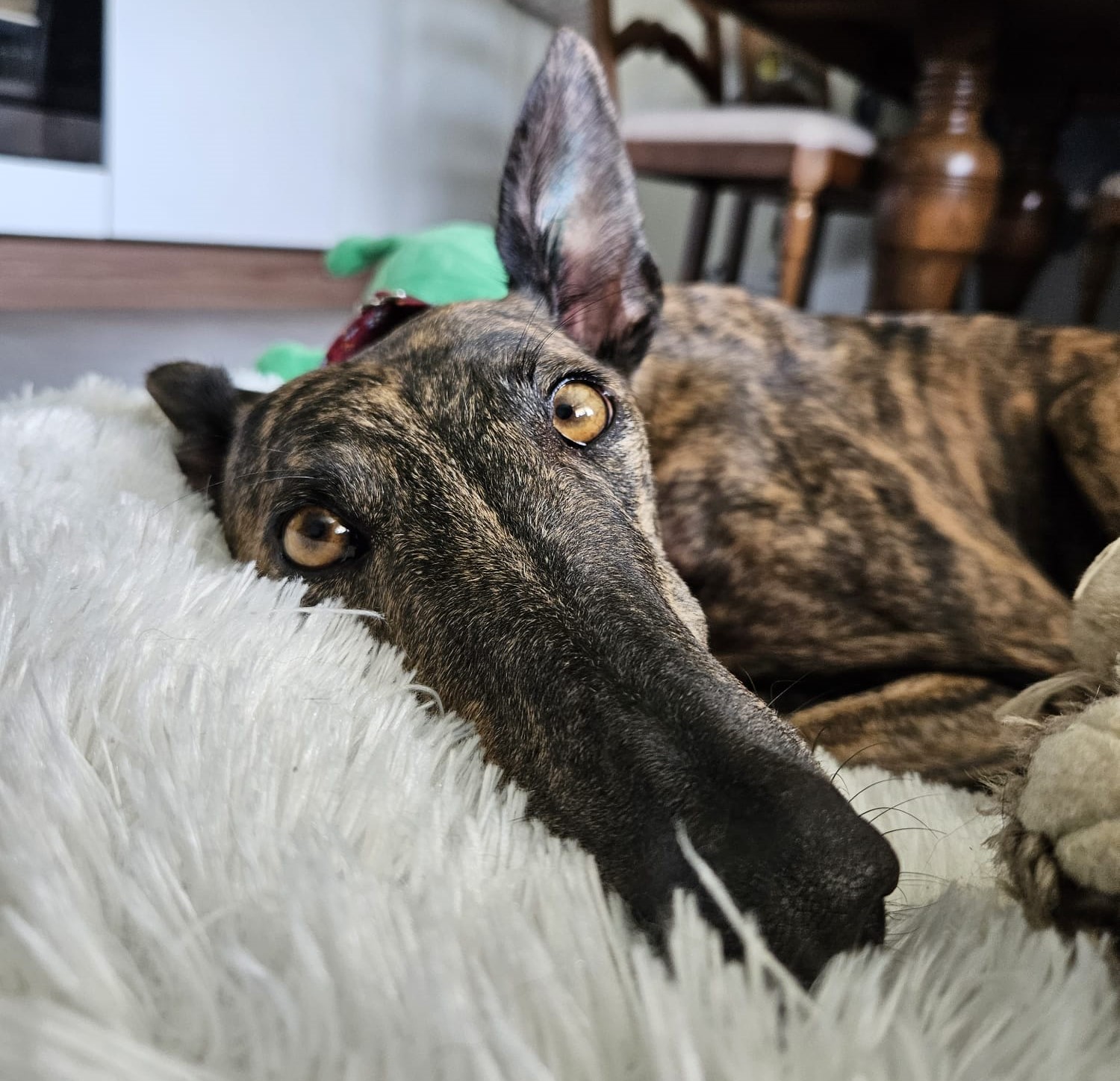 Fabia ist eine ruhige Galga. Sie ist in neuen Situationen noch zurückhaltend und vorsichtig. Jedoch lässt sie sich mit Geduld und guten Leckerlies überzeugen. Aufdringliche Hunde mag sie nicht so gern, aber sonst kommt sie gut mit anderen Hunden klar. Sie läuft sehr fein an der Leine und orientiert sich gut am Menschen. Sie liebt Spaziergänge vor allem im Wald. Fabia ist eine echte Schnüfflerin. Im Haus und im Garten fühlt sie sich schon sehr wohl. Sie liebt ihren Platz auf der Couch, den sie gleich am ersten Tag für sich gefunden hat. Autofahren ist noch nicht ihre Lieblingsbeschäftigung, aber sie hat sich schon recht gut daran gewöhnt. Fabia ist von Anfang an stubenrein. Sie wird jeden Tag etwas offener und es ist eine Freude ihr dabei zuzusehen.
